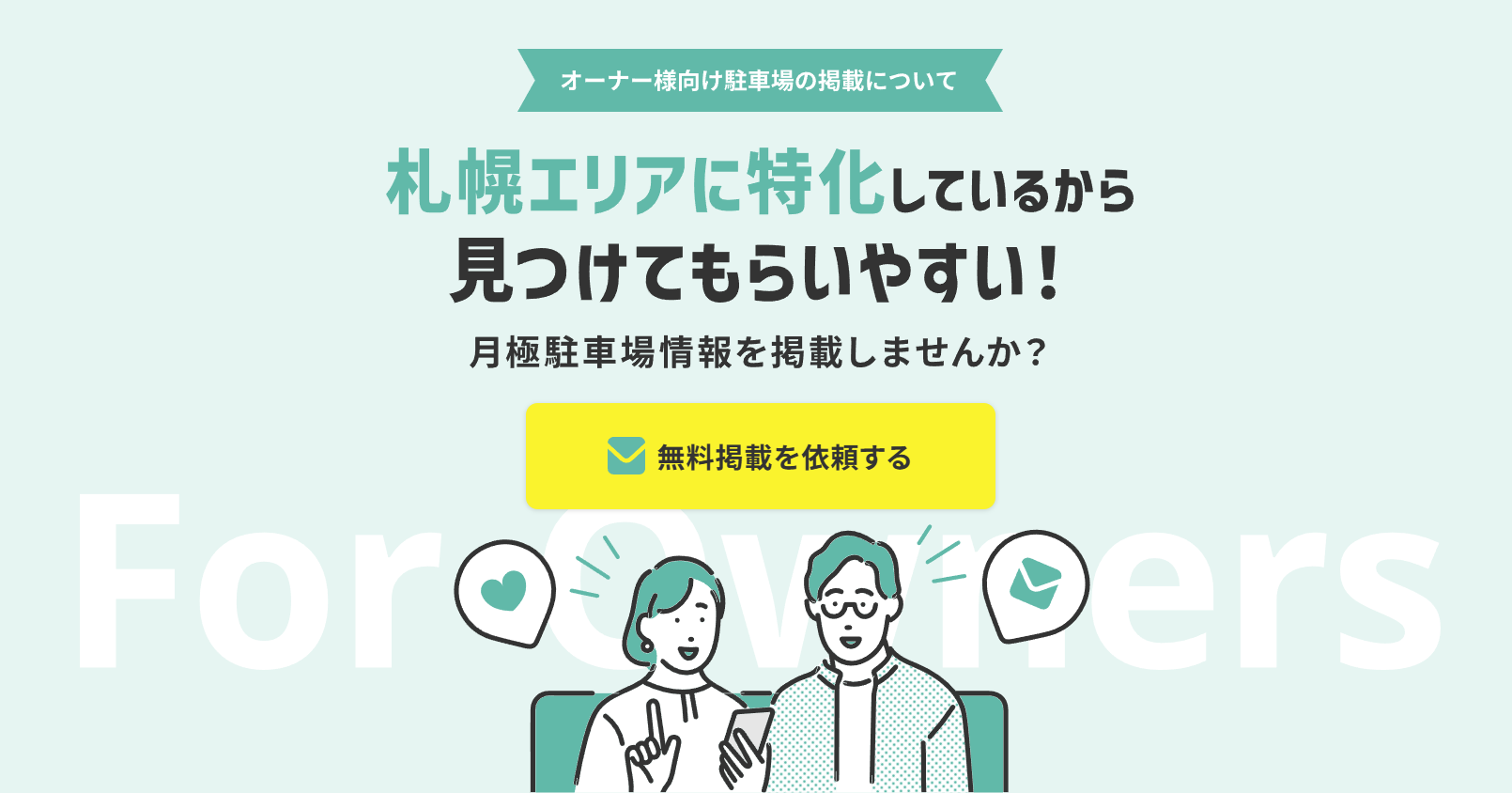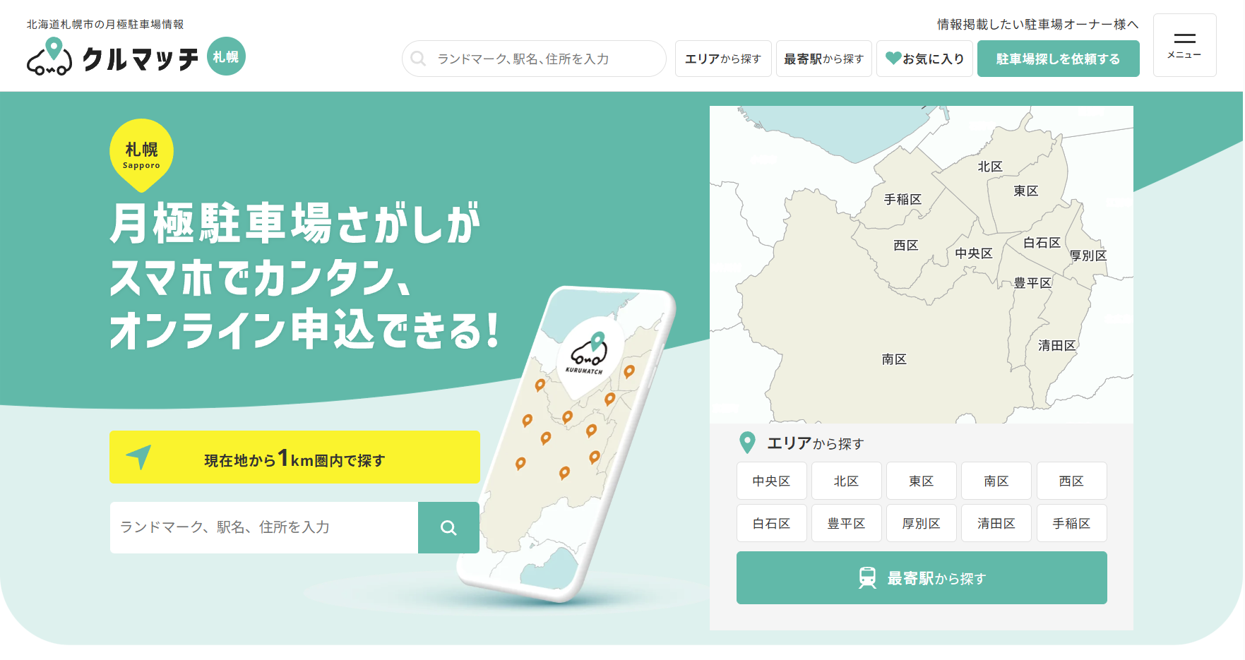 2025年10月03日 サービス 北海道札幌市の月極駐車場マッチングサイト「クルマッチ」 クルマッチは、借りたい人と貸したい人を繋ぐ月極駐車場マッチングサイトです。市区町村・最寄駅・現在地・マップからカンタンに月極駐車場を探せます。また、駐車場探しをご依頼いただくことも可能です。非公開物件も多數ご用意しておりますのでお気軽にお問い合せください。 札幌の月極駐車場検索クルマッチ 月極駐車場オーナー様向け情報掲載もオンラインで承っております。掲載無料、お客様紹介無料、完全成果報酬型です。札幌エリアに詳しい駐車場専門のスタッフが、お電話・メール・LINEで素早く丁寧に対応させていただきます。 月極駐車場情報掲載について 掲載のお問い合わせ
